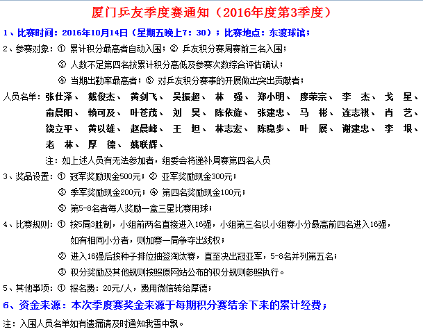 2016年厦门乒友积分季度赛(第3季)(10月14日)
