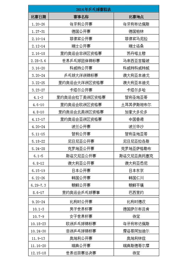 2016精彩继续 全年乒乓球赛程表