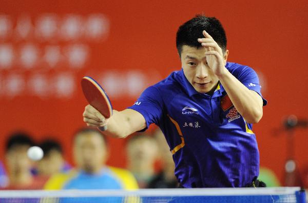 新华社照片,厦门,2014年4月18日 (体育)(3)乒乓球——中国男乒继续进行队内热身赛 4月18日,马龙在比赛中回球,他以3比1战胜张继科。 当日,正在厦门封闭集训的中国男子乒乓球队继续在集美大学体育馆进行队内热身赛,备战将于4月28日至5月5日在日本东京举行的第52届世界乒乓球团体锦标赛。 新华社记者姜克红摄