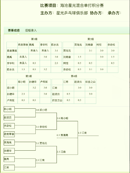 B组,雪中飘实力虽略占上风,但与其他选手差距不大,故打得难解难分,尤其是面对欧志雄时,接发球环节处理不好,频频被对对手进攻得分,雪中飘小球、控制等还是不错,打法比较全面,面对欧志雄的出神入化的发球还是吃亏,可想而知,欧志雄的发球是相当不错,最终1:2不敌败北。雪中飘凭借全胜其他选手的优势以小组第二的成绩晋级。欧志雄则以全胜的战绩挺进八强。