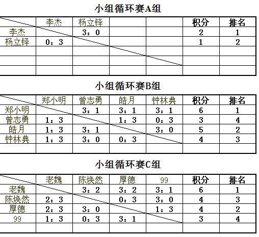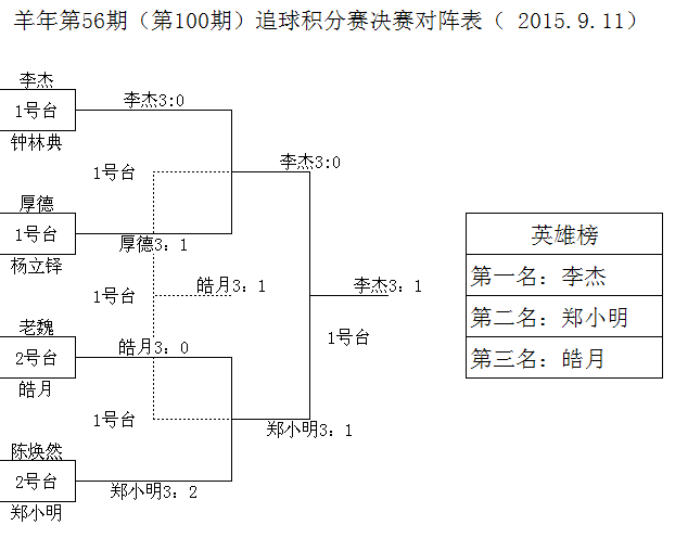 2015年9月11日,厦门乒友第100期积分赛在追球球馆举行。战果如下:李杰第一名,郑小明第二名,皓月第三名。