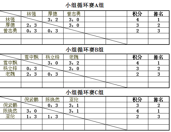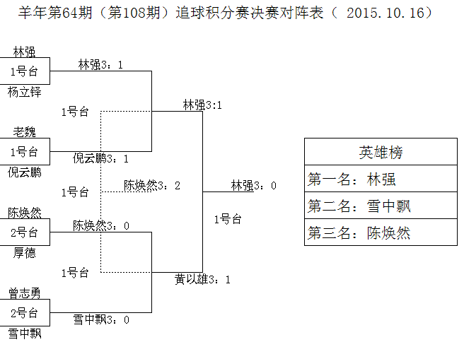 2015年10月16日,厦门乒友第108期积分赛在追球球馆举行。战果如下:林强第一名,雪中飘第二名,陈焕然