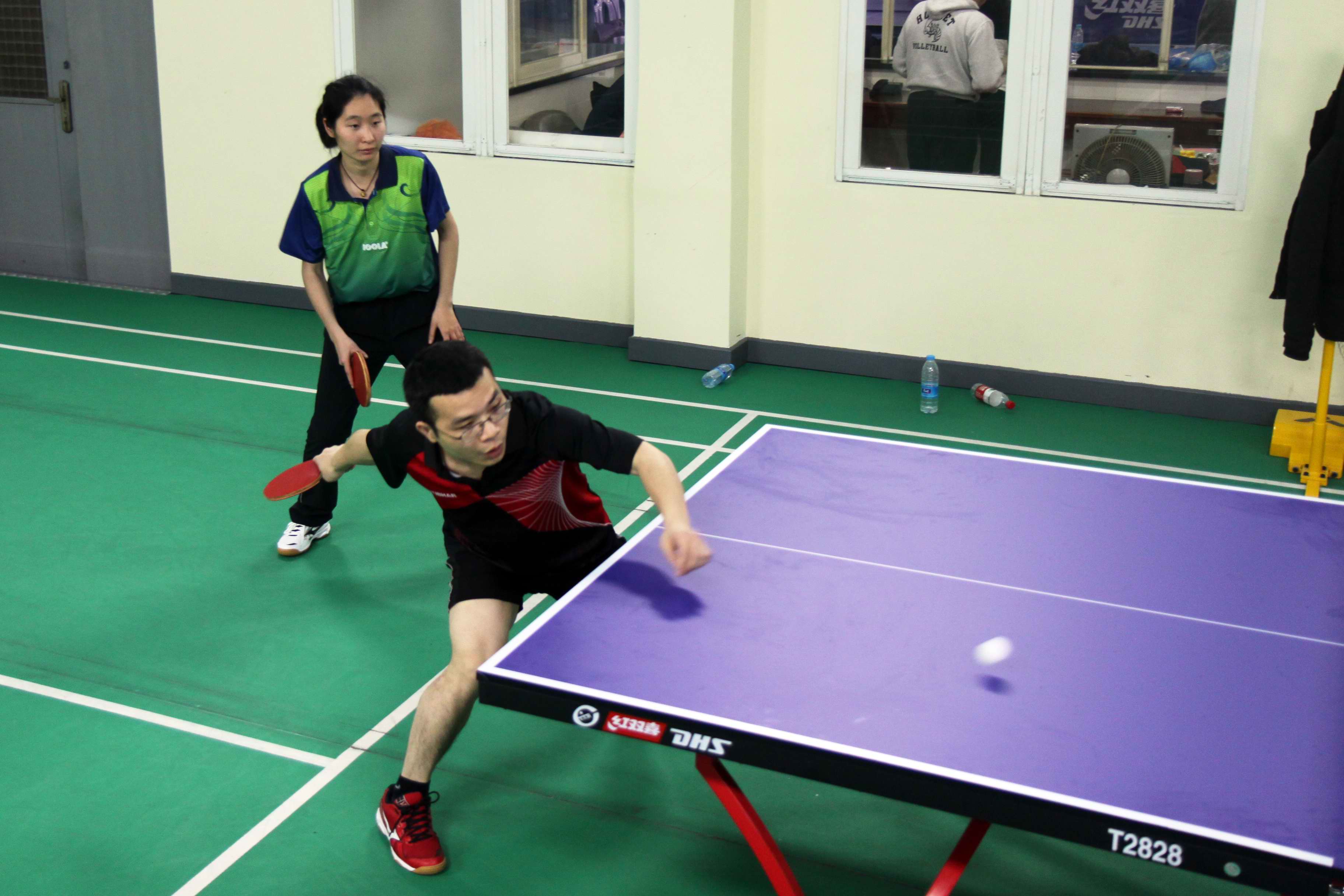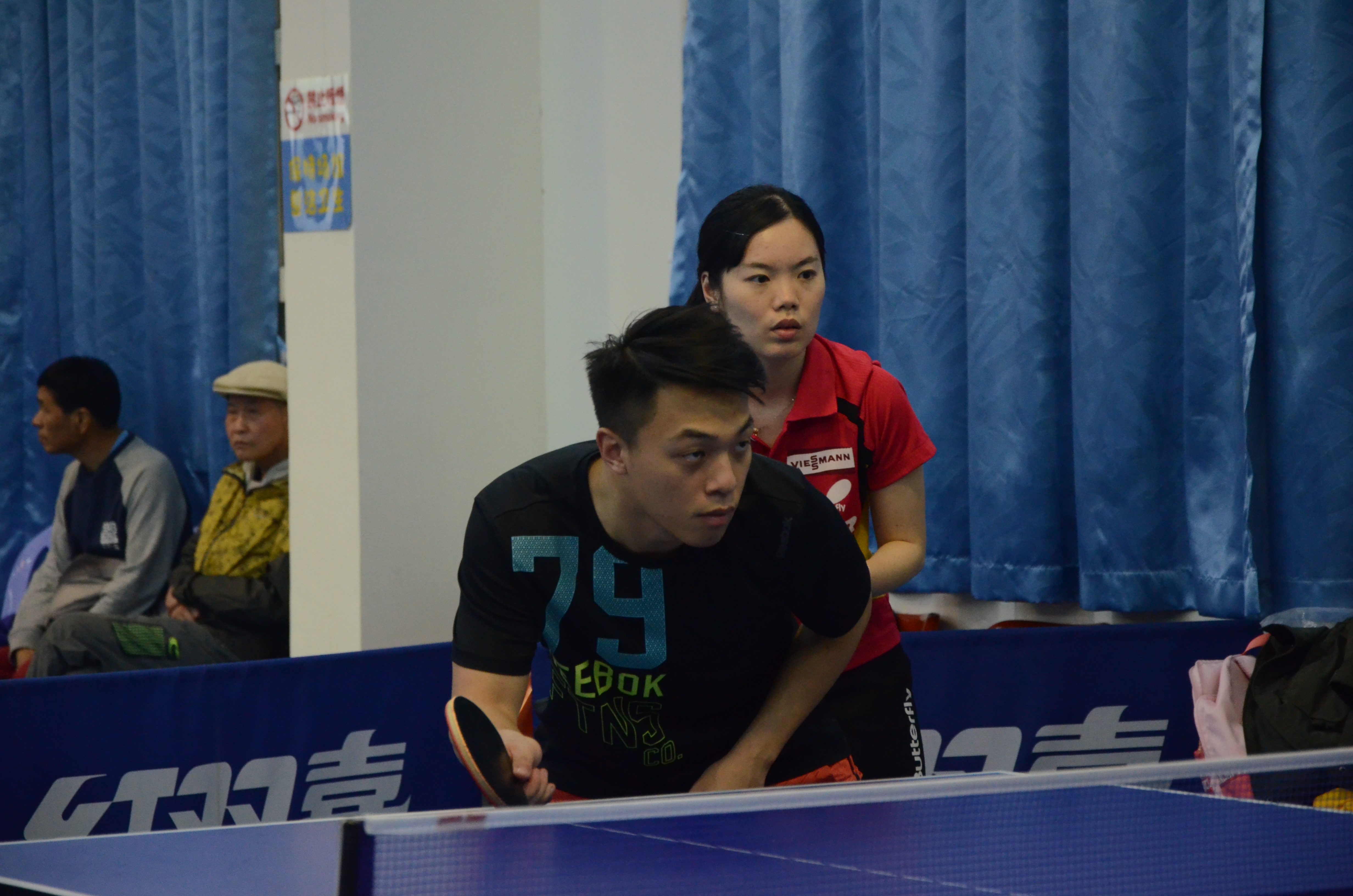 李秀兰、陈海哥组合虽然年龄不小,但配合默契,锁定小组第二,晶晶、卢源,杨悦、杨承峰组合虽然实力有限,但也发挥出了自身水平。尤其是杨悦、扬承峰作为全场唯一一对父女组合,成为一道亮丽的风景线。第2组:本组是死亡之组。种子王书麟、黄剑飞自不必说,黄剑飞是厦门知名业余高手,目前积分赛积分最高纪录保持者;郭龙秀、陈宇星都是少年新秀,虽然都是高中生,但实力不弱,郭龙秀在乒协“巾帼杯”上勇夺青年组第四名;姚佩珊、李伟组合中,姚佩珊是港务集团女一号,李伟也是厦门老牌高手之一。三组选手的竞争异常激烈,最终王黄组合和姚李组合携手出线,郭陈组合遗憾出局,至于林文、郭宗信组合虽然限于实力小组垫底,但两人积极参与、乐在其中,看不出失利者的沮丧。