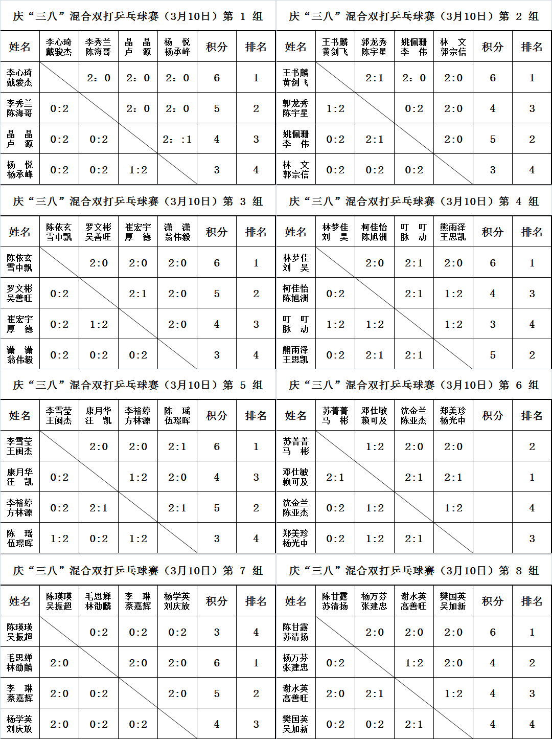 第8组:本组又一对情侣组合陈甘露、苏清阳,曾获得两届“球王”赛家庭组亚军和去年瑞景简杰混双赛亚军,小组第一毫无疑问。至于其他三对中老年组合杨万芬、张建忠,谢水英、高善旺,樊国英、吴加新,上演了一场混战。本组也是唯一出现三不和的小组,最后杨万芬和张建忠靠小分优势,挤上了16强的末班车。