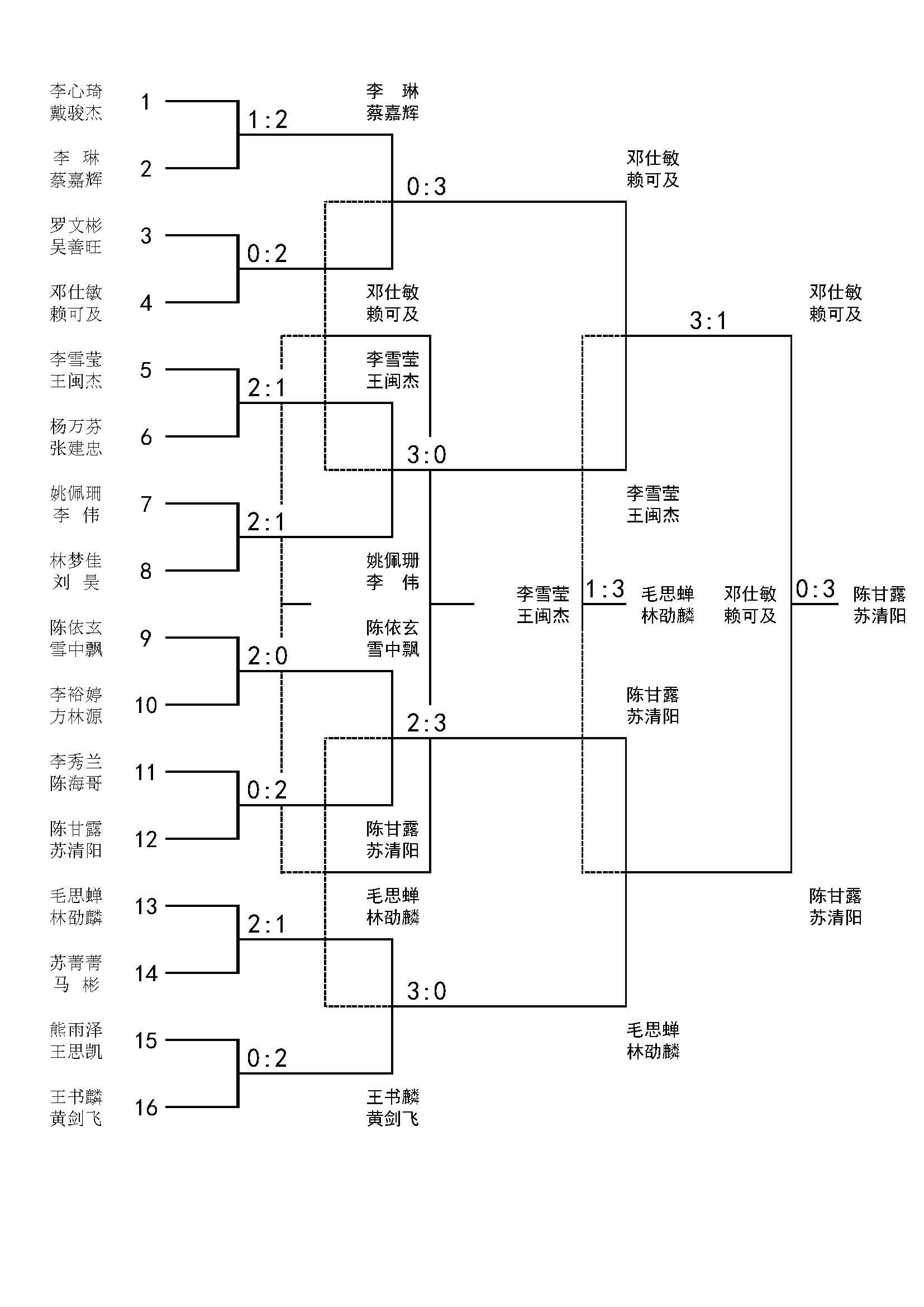 杰前一天才从香港回来,李心琦直到比赛开始前1小时才从福州出差回来,客观上影响了状态,否则以两人情侣搭档的默契程度,有机会走得更远。两强过早相遇,出局固然遗憾,但李戴组合为了赶上这次比赛,不远千里赶回来参赛的热情,令人十分感动。至于罗文彬、吴善旺作为业余组合,要想跨过有体校背景的邓仕敏、赖可及组合,还是不大现实的。首场1/4决赛在李蔡组合和邓赖组合之间进行,虽然单个实力相对未必占上风,但邓赖作为师兄妹组合,默契程度明显胜过一筹,夺得4强席位。李雪莹、王闽杰组合则遭到了两位中年高手杨万芬、张建忠的猛烈狙击,但还是以2比1险胜挺进前八。而姚佩珊、李伟组合则发挥出左右手配合的威力,2比1力克实力强劲的林梦佳、刘昊组合,但在1/4决赛还是体现出实力的硬伤,0比3不敌李王组合,李王组合夺得第二个4强席位。随后的首场半决赛,邓仕敏、赖可及在配合上明显胜过李雪莹、王闽杰,3比1率先进入决赛。下半区: